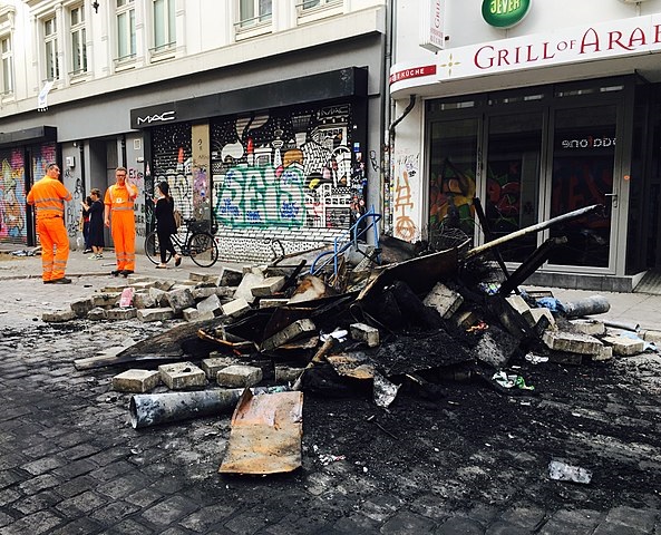 Foto: Cosmicgirl (Anja Jung) / Wikimedia Commons (https://commons.wikimedia.org/wiki/File:Brandreste_Barrikaden_a_Schulterblatt_Hamburg_2017-07-08.jpg?uselang=de)
